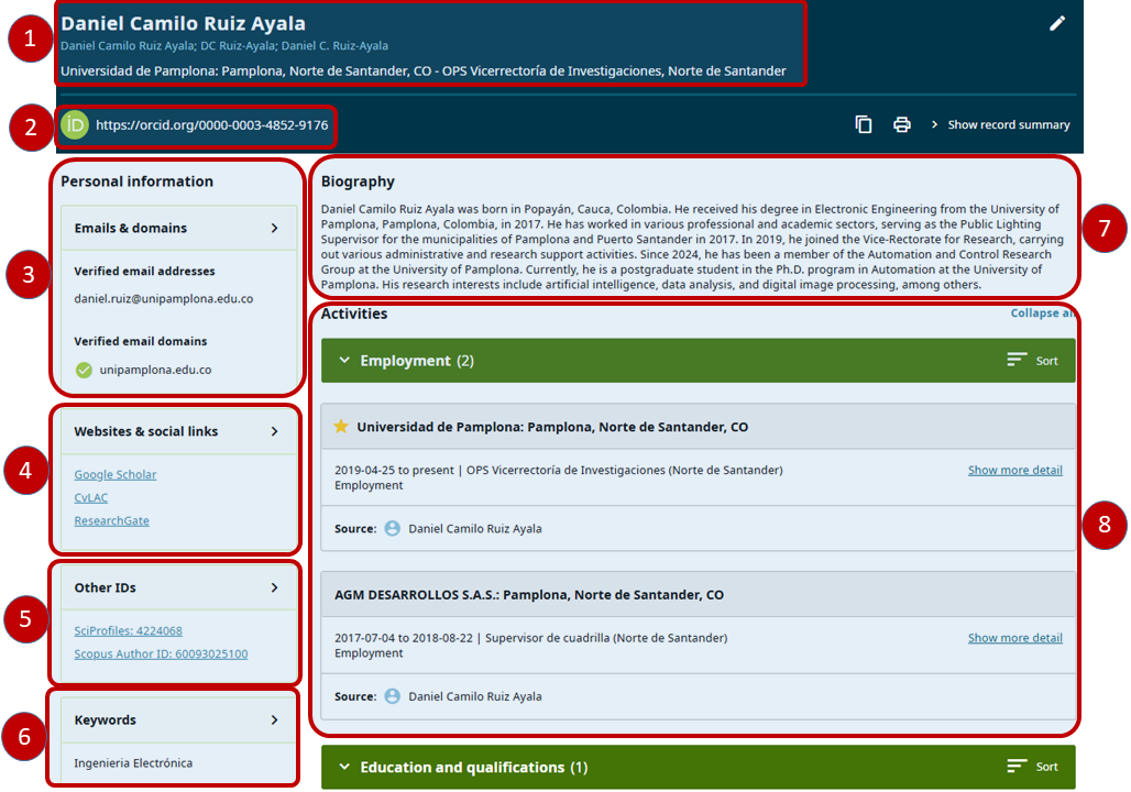 El perfil ORCID organiza la información en el bloque Actividades, estructurado en empleo, educación, financiación y obras.