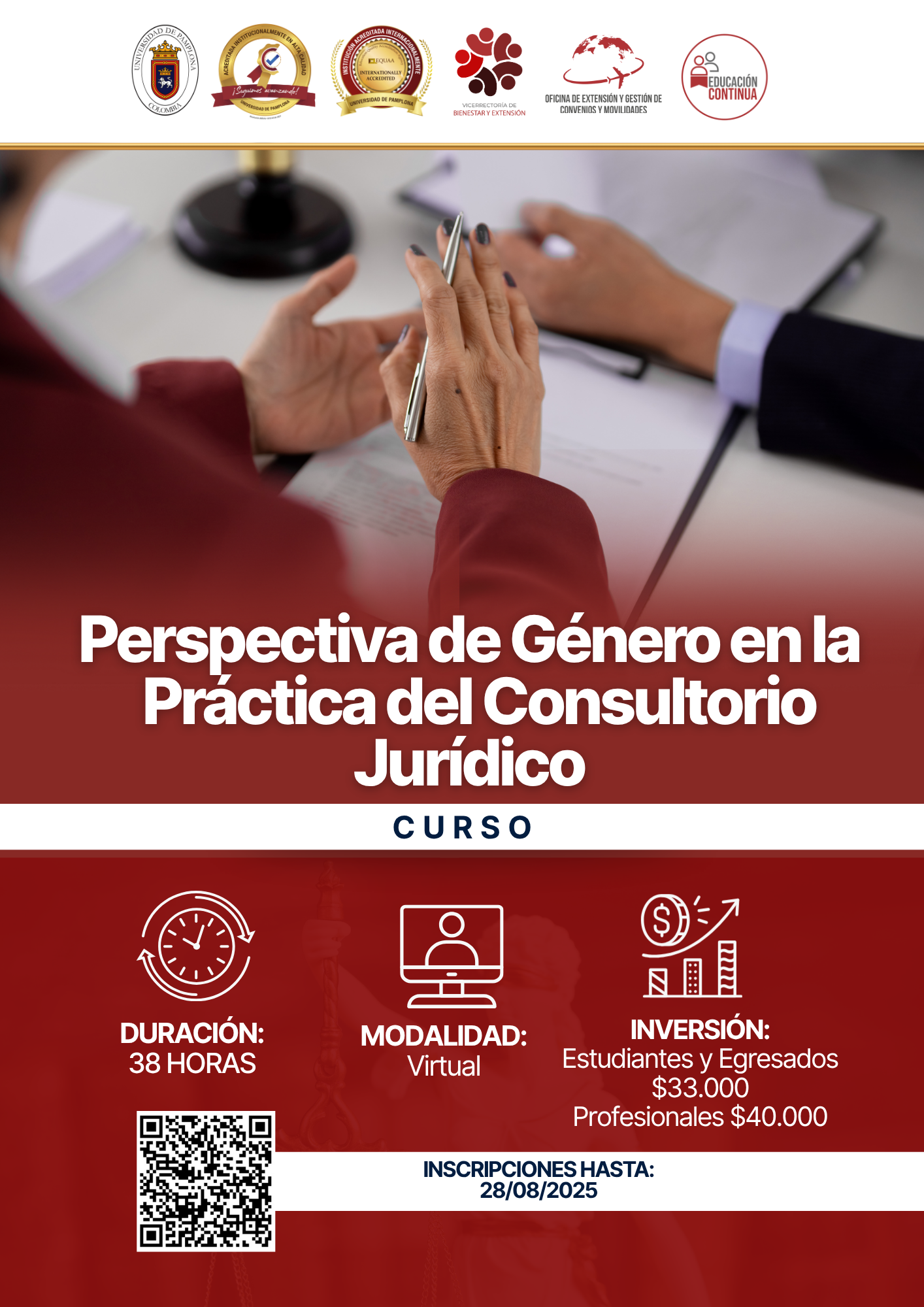 El curso “Perspectiva de Género en la Práctica del Consultorio Jurídico” busca dotar a estudiantes y personal de competencias especializadas para identificar, valorar y litigar casos de violencia de género conforme a la normativa colombiana e internacional, mejorar la atención interdisciplinaria y garantizar el debido proceso en el régimen disciplinario estudiantil, con el fin de fortalecer la calidad de los servicios jurídicos, proteger eficazmente los derechos de las víctimas y consolidar al Consultorio Jurídico como referente institucional en la defensa de poblaciones vulnerables.