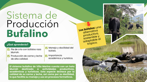 El Centro Experimental Villa Marina cuenta actualmente con un pie de cría de búfalos, predominando la raza Murrah, reconocida por su alta eficiencia productiva. Estos animales están destinados al desarrollo de actividades académicas, productivas y también turísticas, aprovechando las bondades que ofrece esta especie. Los búfalos destacan por la excelente calidad de su leche, rica en sólidos totales y adecuada para la elaboración de productos como quesos y derivados, así como por su carne, que presenta características nutricionales favorables.